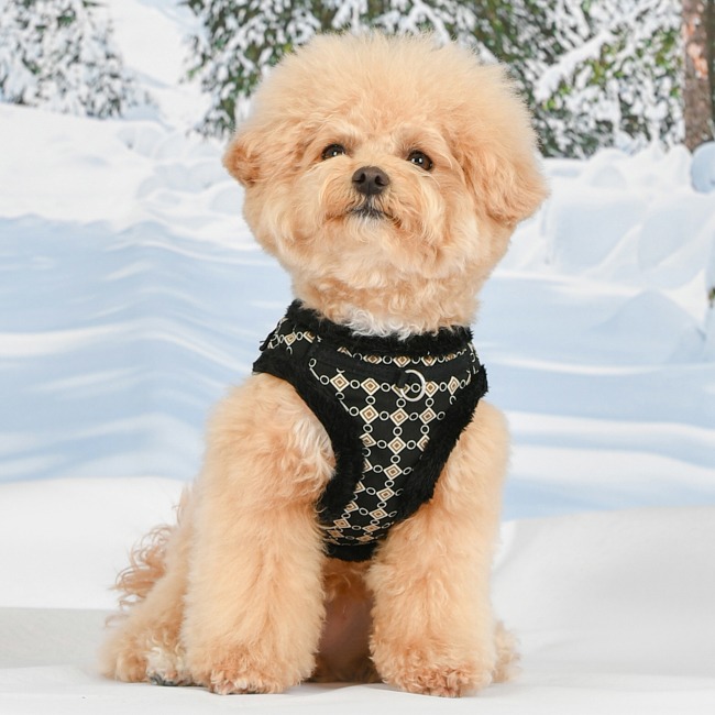 Een patroon met ruitjes en rondjes en natuurlijk de heerlijk zachte vacht en omzoming waardoor je een heerlijk wintertuigje hebt. Het is gemaakt van polyester, de voering en de omzoming van het tuigje zijn superzacht. Wat betreft de afwerking van de tuigjes, geen losse naadjes of onzorgvuldigheden. Met de voorpoten moet je hond in het tuig stappen waarna het gemakkelijk sluit als een vest door middel van klitterband en een riempje met een kliksluiting. Het heeft geen harde delen dus zal het fijn zijn om te dragen. De loopriem wordt bevestigd boven de schouderbladen waardoor dit geen stress in de nek en rug zal geven. Een bijpassende riem, met hetzelfde motief is met korting mee te bestellen (deze wordt vanzelf zichtbaar bij je bestelling).